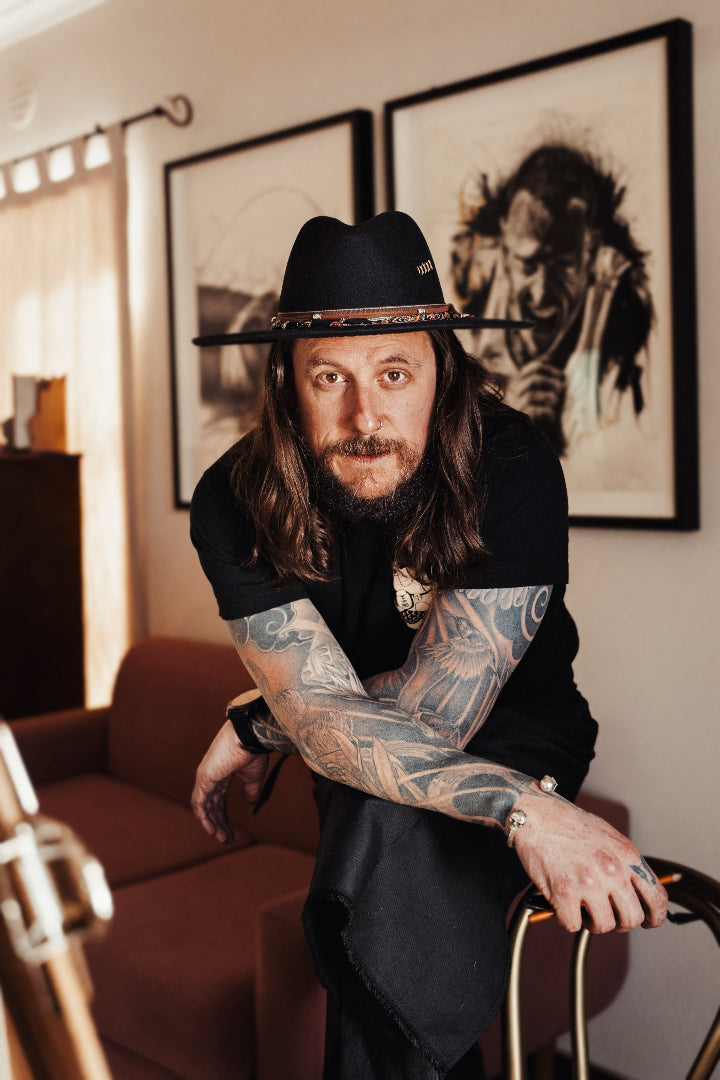Raised in South Africa and shaped by overland journeys across the continent—first as a wide-eyed child, later as a curious adult, his charcoal works capture the soul of people that refuse to be tamed.